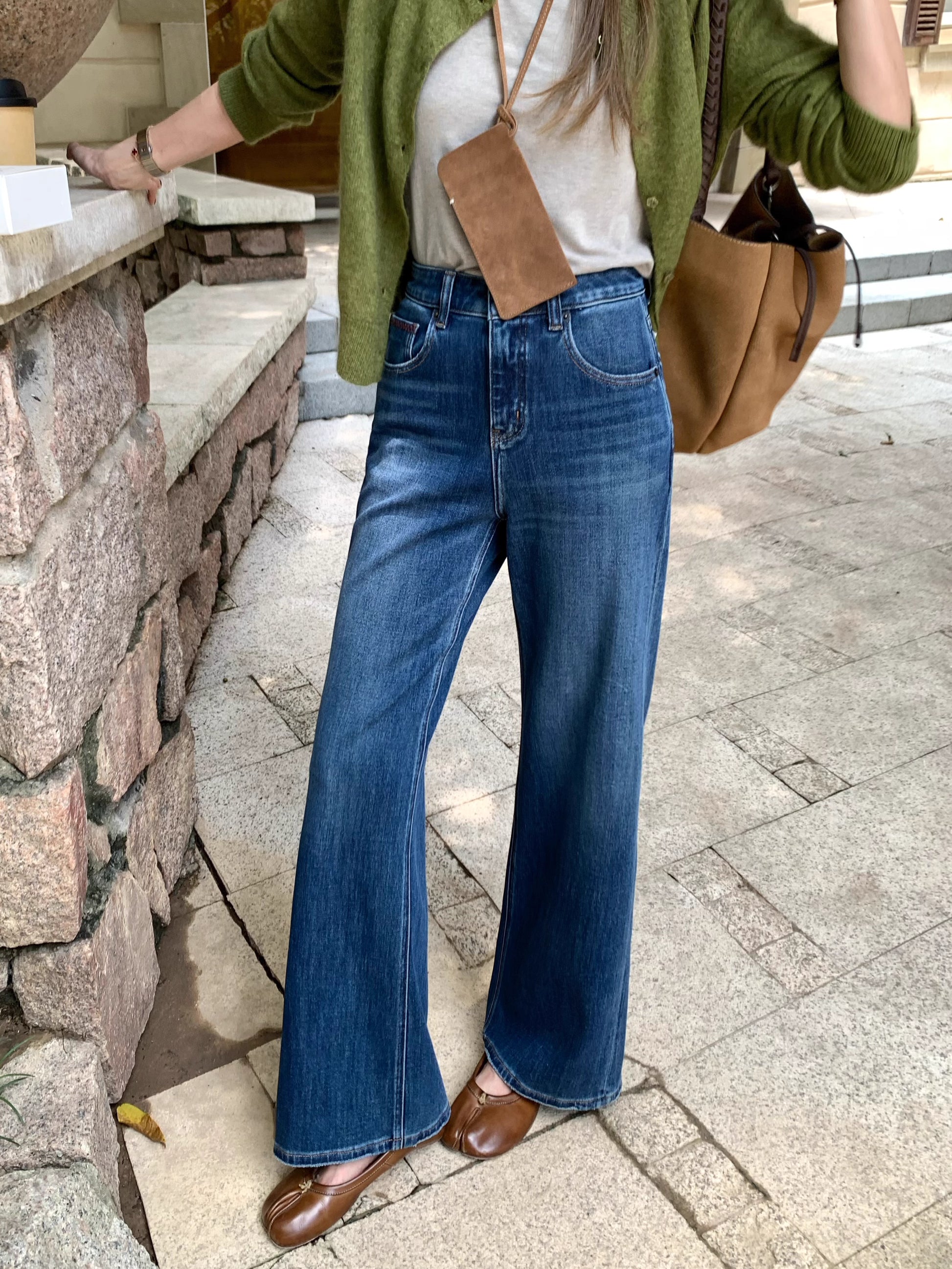 กางเกงขาตรงเอวสูงสีฟ้า ผ้ายืดสี่ทิศ ทรงขาบานแคบ